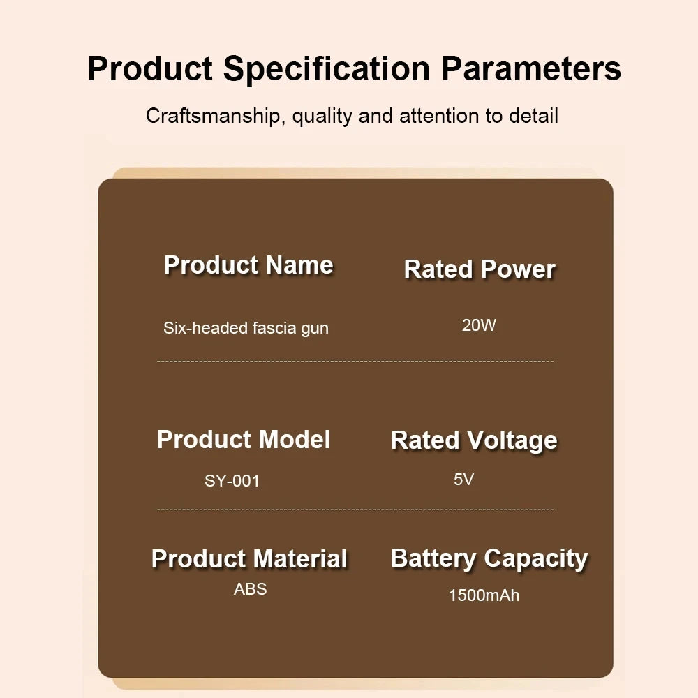 Pistolet de massage à 6 têtes intégré : Six têtes fonctionnent en synergie pour disperser les vibrations sur une zone de couverture 300 % plus grande que les pistolets de massage à une tête traditionnels, particulièrement adaptés pour cibler les nœuds sur des groupes musculaires plus gros.