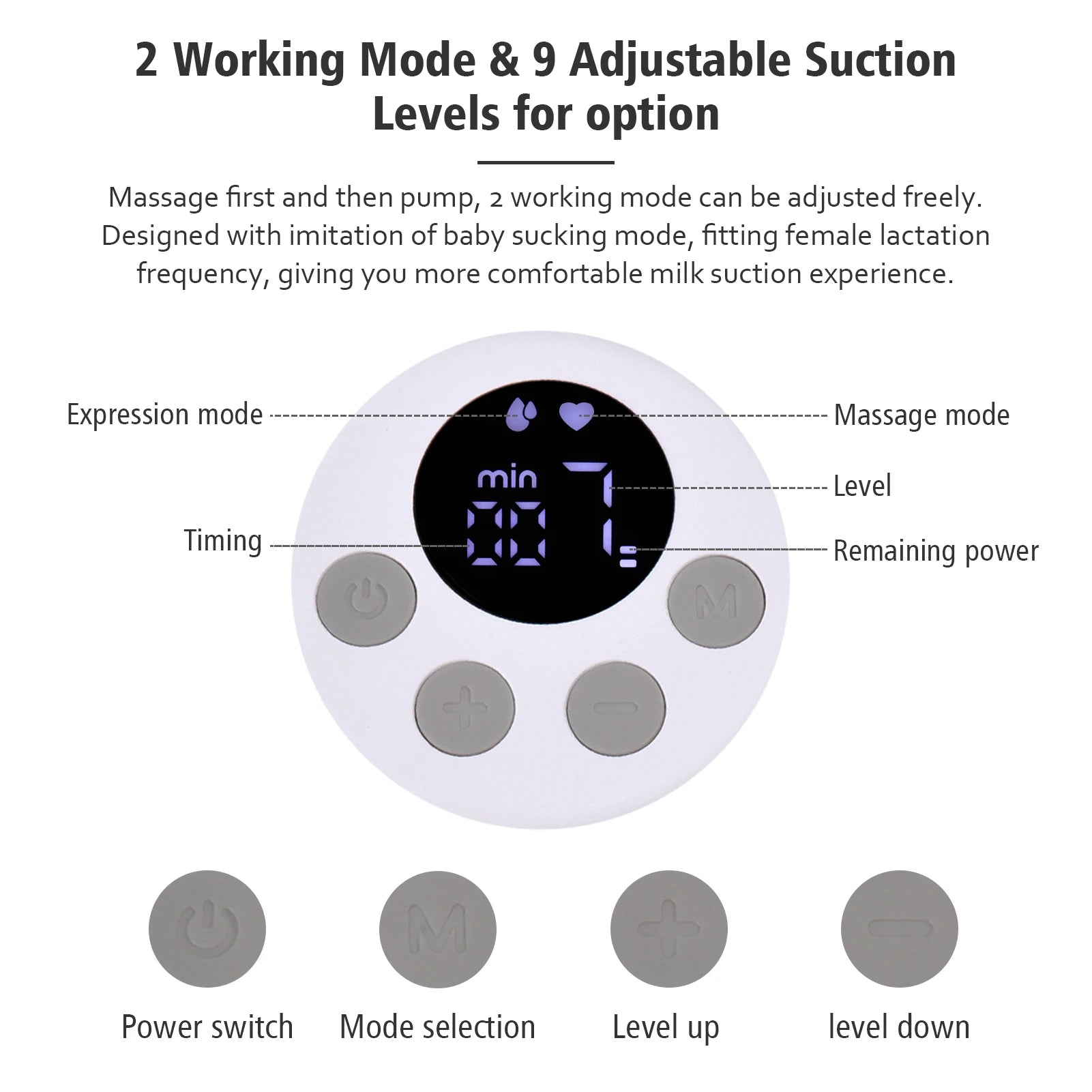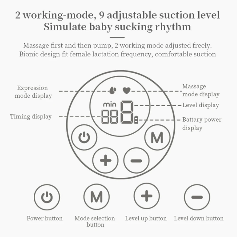 2 modes (pompage du sein et massage) et 9 niveaux d'aspiration pour l'option, vous donne toujours l'expérience de succion de lait la plus confortable. La fonction de mémoire se souviendra des réglages utilisés la dernière fois, ce qui rend votre pompage du lait plus efficace.