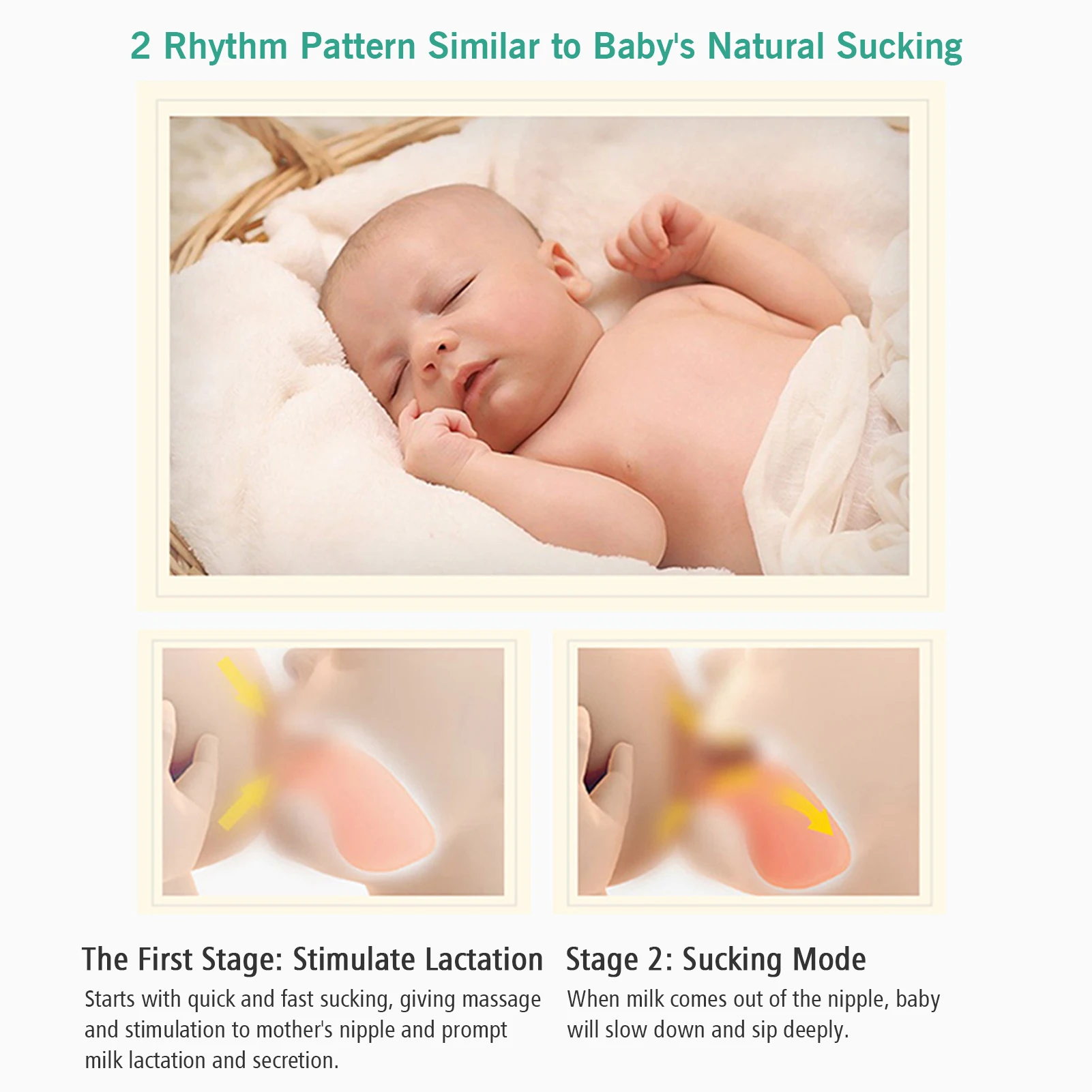 Imitez le schéma d'alimentation du bébé, au début du processus d'aspiration du lait, le mode haute fréquence stimulera doucement la lactation du lait, lorsque le lait commence à couler, il passera à une aspiration lente et profonde, réduisant le temps d'aspiration et augmentant la sécrétion de lait.